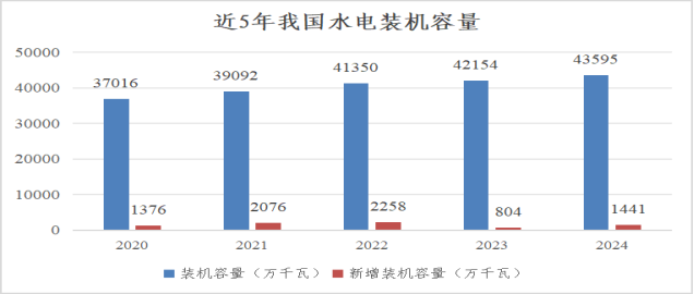 水电作为常规电力中**的可再生能源,2024年总体呈现出稳定增长的发展趋势,并且在全球范围内保持**地位。截至当年底,我国水电总装机容量达到4.36亿千瓦,占我国电力总装机的13.02%,较2023年新增装机容量1378万千瓦,同比增长3.2%,其中,常规水电装机规模3.77亿千瓦、同比增加625万千瓦;抽水蓄能装机规模5869万千瓦、同比增加753万千瓦。全年水电发电量14239亿千瓦时,占发电总量的13.53%,仅次于火电,排在第2位;规模以上水电年平均利用小时数为3349小时。在双碳目标和新能源快速发展的大背景下,水电以其稳定、清洁的特点,成为我国清洁能源供应的可靠保证。