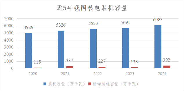 2024年是我国核电发展具有里程碑的一年,全年新核准11台核电机组,为历年核准数量之最,连续3年核准机组数量超过10台;投入运行核电机组2台,新增额定装机规模240万千瓦;在运、在建和核准待建核电机组共有102台,总装机容量1.13亿千瓦,连续2年位居全球首位。截至当年末,全国运行核电机组共有57台(不含台湾地区),额定装机容量为5943.17万千瓦。全年累计核电发电量为4451.75亿千瓦时,比上年同期上升了2.72%,占全国累计发电量的4.73%,超过太阳能发电量,排在第4位。由此可见,我国核电装机占全国总装机的比例不到2%,但发出的电量接近全国总发电量的5%。年设备利用小时数为7805.74小时,平均机组能力因子为90.26%。